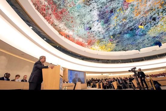 2月26日,在瑞士日内瓦,联合国秘书长古特雷斯在联合国人权理事会第37次会议上发言。新华社/法新