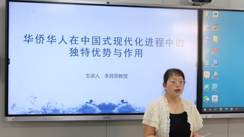 5月30日下午,浙江传媒学院文学院在敬业楼A218教室成功举办主题为《华侨华人在中国式现代化中的独特优势与作用》的学术讲座。本次讲座特邀华中师范大学知名教授、武汉侨务理论研究中心/中央统战部、国务院侨办侨务理论研究武汉基地创始主任,中国世界民族学会副会长李其荣教授担任主讲嘉宾,讲座由文学院汉语言文学系主任贾改琴主持。