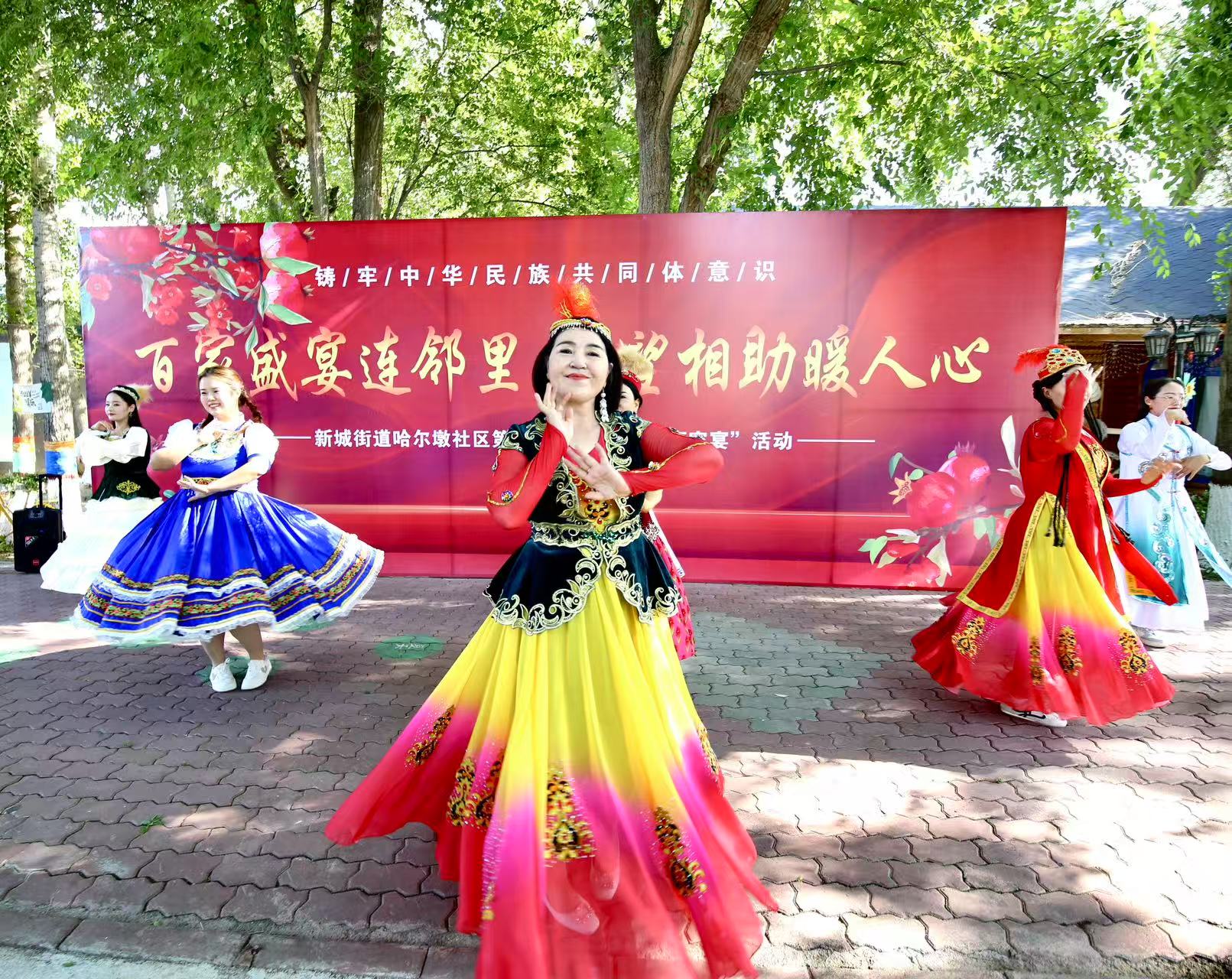 当天,哈尔墩社区广场上热闹非凡,伴随着欢快的歌声和欢呼声,“百家宴”正式开始。采访团成员与当地居民共同围坐在桌前,桌上铺满了各家的拿手菜肴:奶疙瘩、拉条子、抓饭、烤列巴、馕饼、拌凉菜……香气四溢,色彩缤纷。