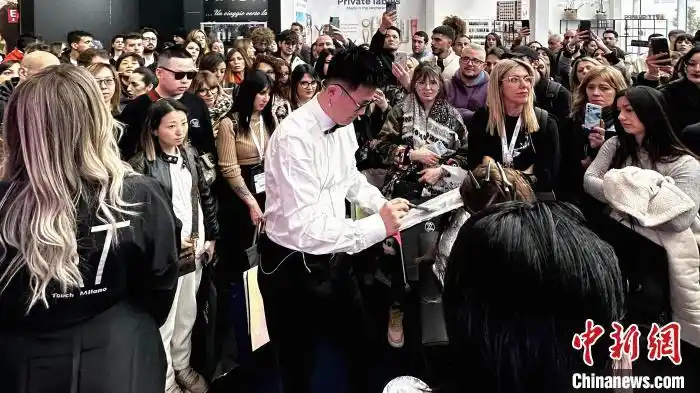 2023年3月,施盛杰在意大利艾米利亚-罗马涅大区首府博洛尼亚市举行的一场国际美容展会上展示染发技术。受访者供图