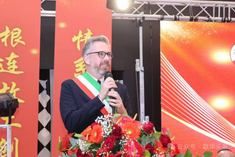 博洛尼亚市长Matteo Lepore发表讲话。Matteo Lepore市长表示非常高兴出席旅意中区华侨华人联谊会第十三届理事会换届庆典,并与中国侨胞共同见证这一重要时刻。他强调,博洛尼亚是一座开放包容的城市,长期以来与在地华侨华人保持着良好的互动关系。中国侨胞为当地经济发展和多元文化交流作出了重要贡献,是连接中意两国民心的重要桥梁。他表示,博洛尼亚市政府将继续支持侨团工作,愿与旅意华侨华人一道,共同营造更加和谐美好的生活环境,推动博洛尼亚与中国各城市在经贸、人文等领域的交流合作,携手建设一个更美好的未来。