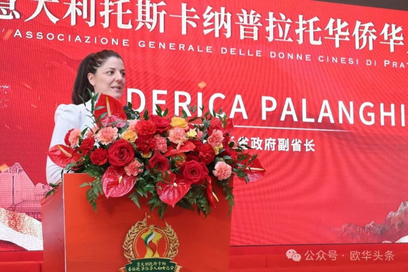 普拉托副省长Federica Palanghi致辞,她代表Simone Calamai省长向普拉托妇女总会的成立表示热烈祝贺。她表示,基于相互尊重与理解,不同文化背景的人们能够携手创造更加美好的未来,社会中的每一个角色都在传递不同的价值观,而女性群体所展现出的责任、坚韧与温暖,正是社区发展不可或缺的力量。今天见证这一女性团体的诞生,是一件令人欣喜的事情。她期待未来在更多女性活动中,加强合作与交流,进一步促进侨界与当地社会之间的联动。