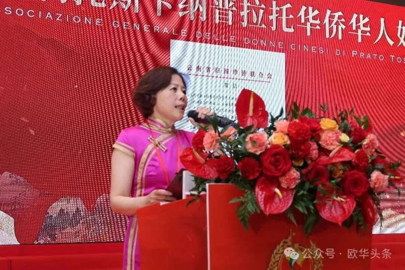 意大利托斯卡纳普拉托华侨华人妇女总会慈善部部长金晓秋宣读云南省归国华侨联合会发来的贺电。