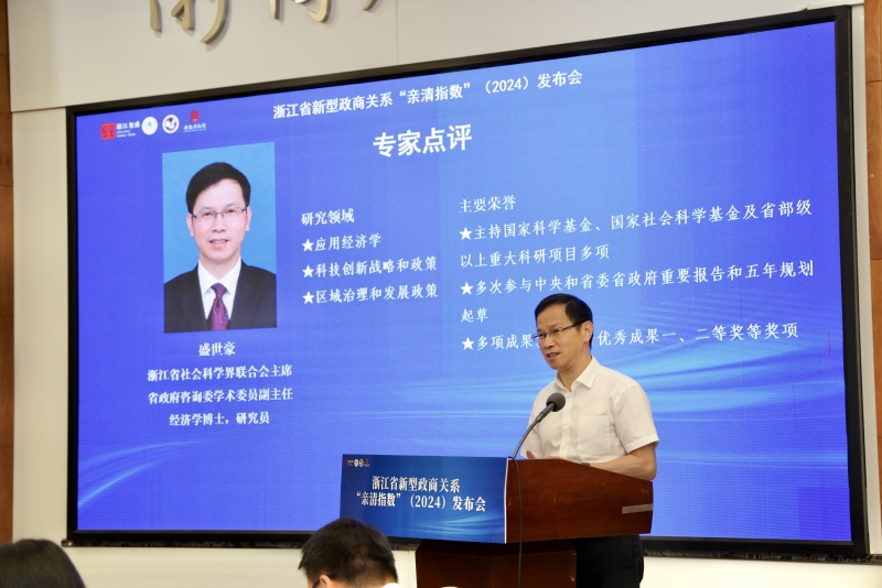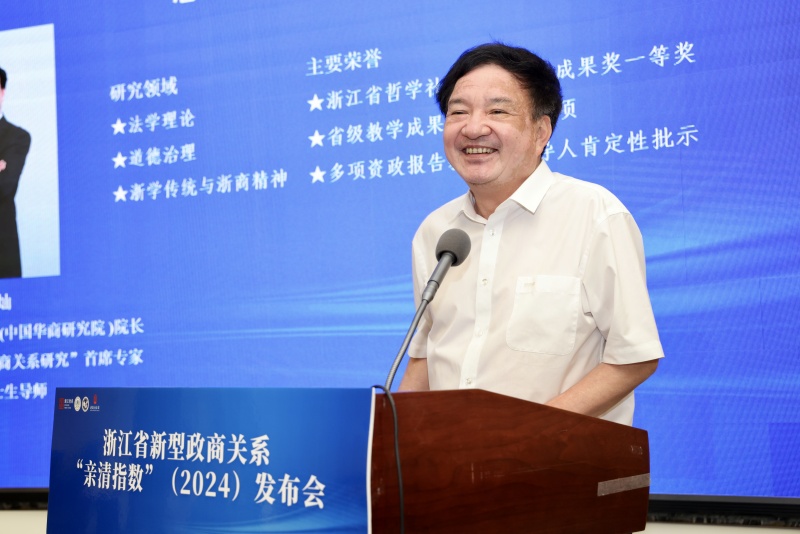 浙江省社科联党组成员、副主席范钧出席会议并致辞,他指出,2016 年全国两会期间,习近平总书记首次提出要建立 “亲”“清” 新型政商关系。今年 3 月,浙江省委书记王浩在专访中明确提出要围绕 “服务最优、成本最低、效率最高”,全力打造最优营商环境。浙江工商大学浙商研究院作为我省第一批省级重点专业智库,牵头发布浙江新型政商关系 “亲清指数” 已到第七个年头,该指数已成为我省乃至全国营商环境研究的代表性成果之一。希望浙商研究院继续整合资源、发挥优势,打造具有全国乃至全球影响力的高端智库,省社科联也将一如既往支持其发展。