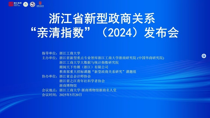 5月20日下午,浙江省新型政商关系“亲清指数”(2024)发布会在浙江工商大学浙商博物馆名人堂召开。本次发布会由浙江省新型重点专业智库浙江工商大学浙商研究院(中国华商研究院)、浙江工商大学大数据与统计指数研究院、浙江工商大学共同富裕可视化与政策仿真实验室、教育部重大招标课题 “新型政商关系研究” 课题组与浙江日报报业集团潮新闻联合主办,浙江省总会计师协会、浙江省之江青年社科学者协会、浙商博物馆协办。