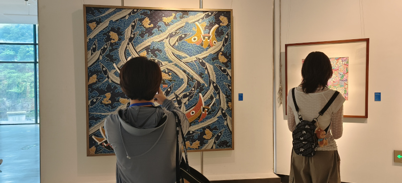 如果说“共栖之舟”主题展体现了舟山的人文精神,那么,另一个主题展——普陀渔民画精品展,就是当下舟山渔家女性热爱生活的真实写照,这些作品以浓烈的色彩、自由的笔触与质朴的情感,成为普陀独特的“文化名片”。