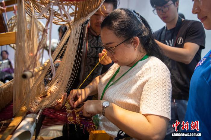 图为来自老挝的媒体人在体验壮锦技艺。中新社记者 翟李强 摄