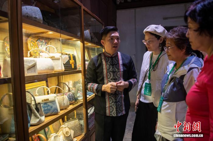 图为壮锦纹样的手提包吸引关注。中新社记者 翟李强 摄