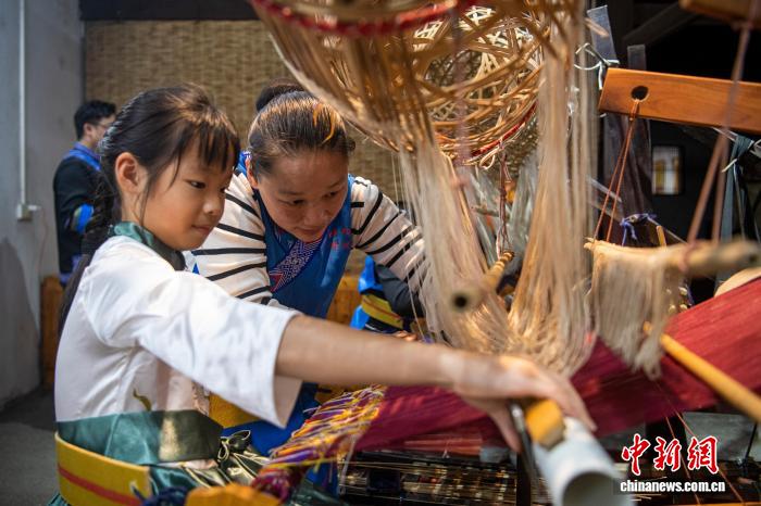 图为小女孩在学习织锦。中新社记者 翟李强 摄