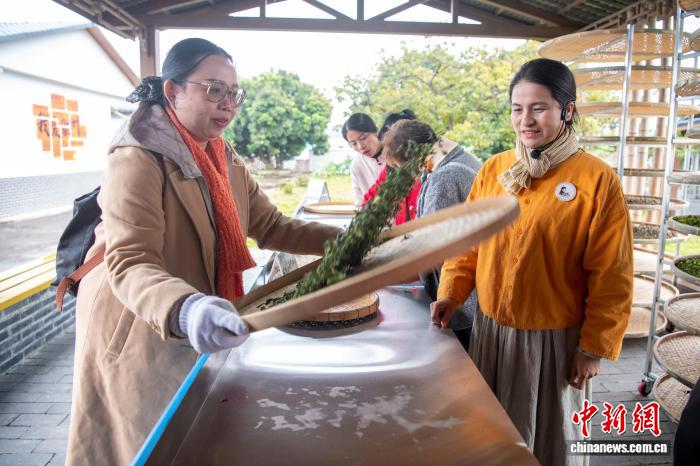 11月18日,来自泰国、柬埔寨、老挝等国家和地区的媒体人,在广西来宾市象州县学习古琶茶制作、茶礼等,体验中国茶文化。象州种茶历史悠久,是唐代陆羽所著《茶经》中记载的岭南主产茶区。图为广西壮族自治区非物质文化遗产代表性项目古琶茶制作技艺代表性传承人冯康玲演示炒茶。中新社记者 翟李强 摄