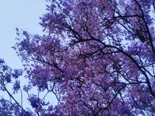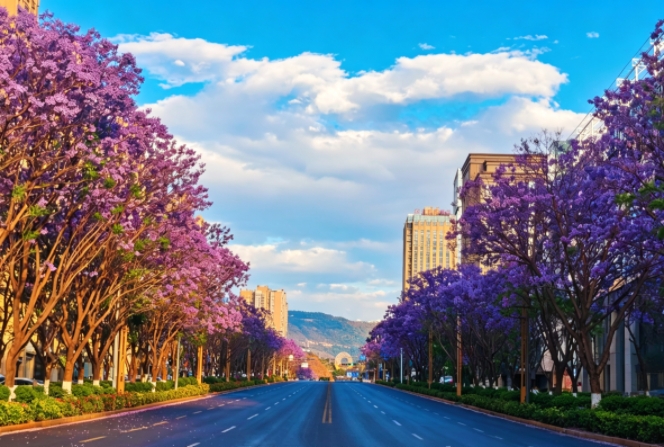 那种淡淡的蓝,是让人心头变得柔软的蓝。风掠过枝头,花瓣簌簌落下,铺成浅紫的小径。行人放慢脚步,有人抬手接住飘落的花,真美啊,大街小巷都笼罩在这一层温柔的紫雾里——蓝花楹开,攀枝花最浪漫的春天来了。