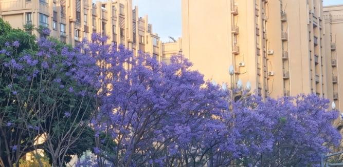 我站在树下,看道路两侧蓝花楹隔空相映,汇成一条美丽的紫色花廊 。花串垂得低,伸手就能触到,阳光透过花隙洒下来,在地面投下斑驳紫影,我放慢脚步,弯腰拾起飘落的小花,感觉连空气里都飘着温柔的香。