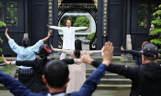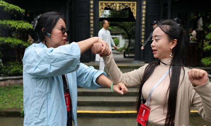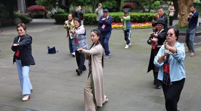 4月13日,来自全球17个国家和地区的20余家海外华文媒体代表走进四川都江堰,参观2000余年历史的水利工程、体验青城武术。图为华文媒体代表学习体验青城武术。中新社记者 张浪 摄