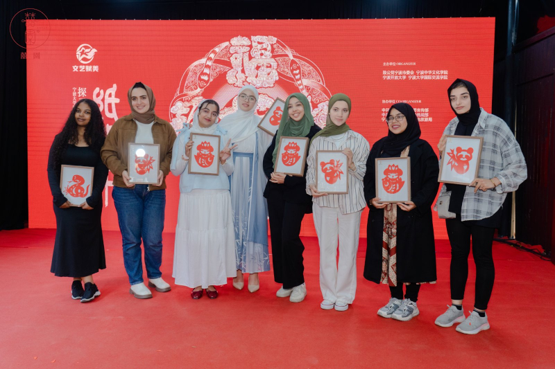 活动邀请了三位非遗传承人——宁波市级非遗剪纸传承人魏晓红女士、浙江省民协剪纸艺委会副秘书长、区级剪纸非遗传承人何贤顺老师、以及非遗盘纸高级技师孙蝶女士。活动现场,国际学生在传承人的指导下体验纸艺创作。这些充满创意的作品,恰似当年丝绸之路上文化交融的当代写照。活动现场学生们带来了精彩纷呈的文艺表演,为这场文化盛宴增添了别样的风采,展现了多元文化交融的独特魅力。