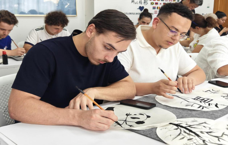 仪式结束后,法国师生在国情教育名师工作室中国文化研学导师吴建明和蒋金岳的指导下,沉浸式体验了中国书画艺术,并创作了自己的人生第一幅中国书画作品,拉开了本次团组活动的序幕。
