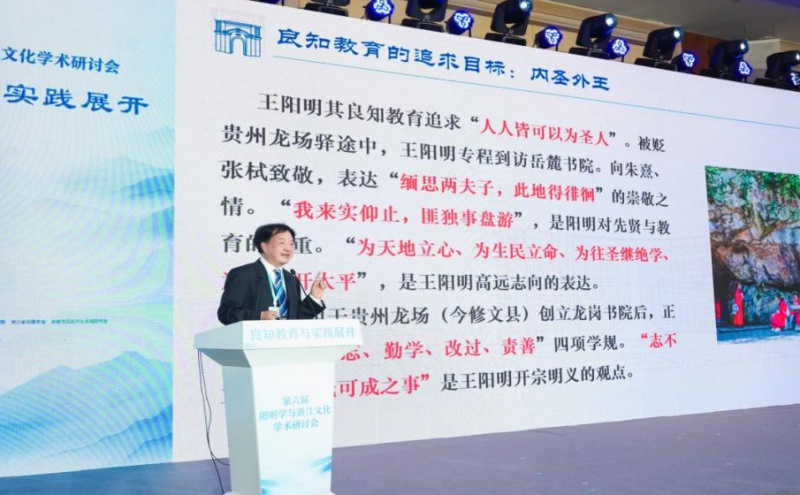 浙江省伦理学会会长、浙江工商大学浙商研究院院长陈寿灿教授在会议总结中系统阐释良知教育的基本内涵,提出其以 “内圣外王”为追求目标,以“独立人格”为主体确立,遵循“知行合一”的实践逻辑。他强调良知教育的行动起点是 “诚爱恻怛”,验证方法在于亲身体验,而师道范式则为 “庄敬自持”,从而构建起完整的良知教育理论框架。这些核心要义既溯源阳明思想精髓,又结合当代教育需求,为良知教育的深化实践提供了清晰指引。