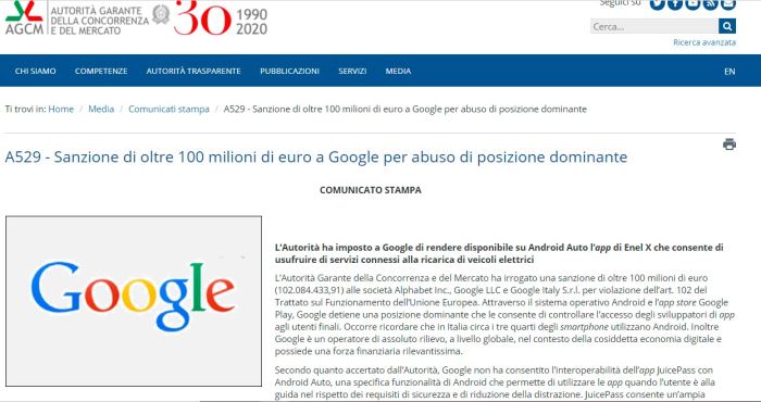 公报指出,谷歌通过安卓系统和谷歌应用商店,利用市场主导地位来控制应用程序开发人员对终端用户的访问。这违反了《欧洲联盟运作条约》102条规定。具体来说,谷歌拒绝意大利电力公司的电动车充电软件在其汽车应用上提供服务,从而限制了用户使用该软件的权利。
