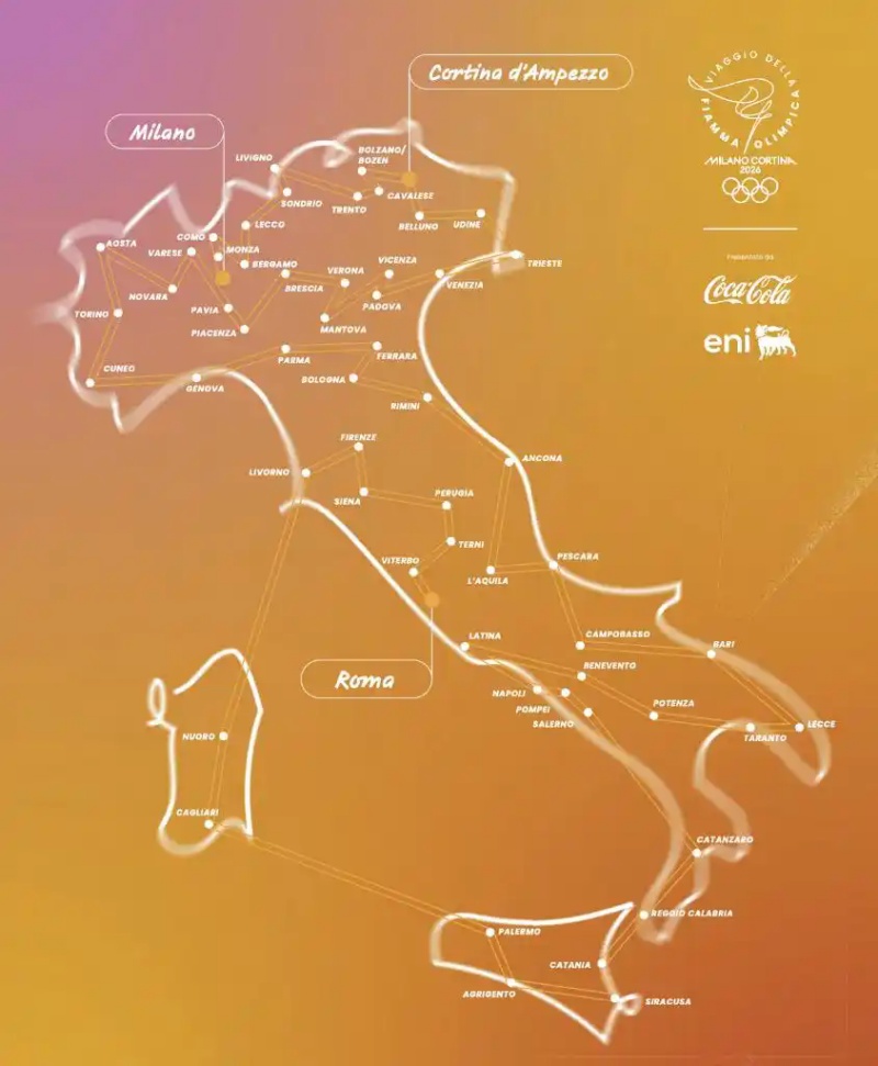 米兰冬奥会火炬在意大利境内的传递路线图。图源:米兰冬奥组委