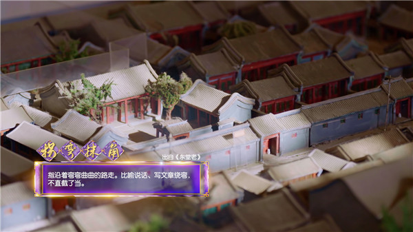 中国文物学会专家委员会主任、故宫博物院学术委员会主任单霁翔在节目里介绍了一个源于北京胡同的成语“拐弯抹角”,旧时胡同狭窄逼仄,在人、车拥挤时很容易撞到角。于是人们会把胡同里的角修成一米多高的斜面或者圆面,人们行走更方便,自家的墙也不会被撞坏。如此“双赢”的民间智慧,也会让今天的我们会心一笑。