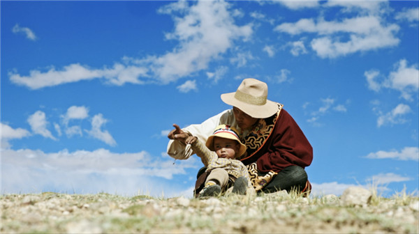 (极高海拔生态搬迁之际,噶玛朗加和儿子在佐德草原上看藏羚羊种群迁徙)